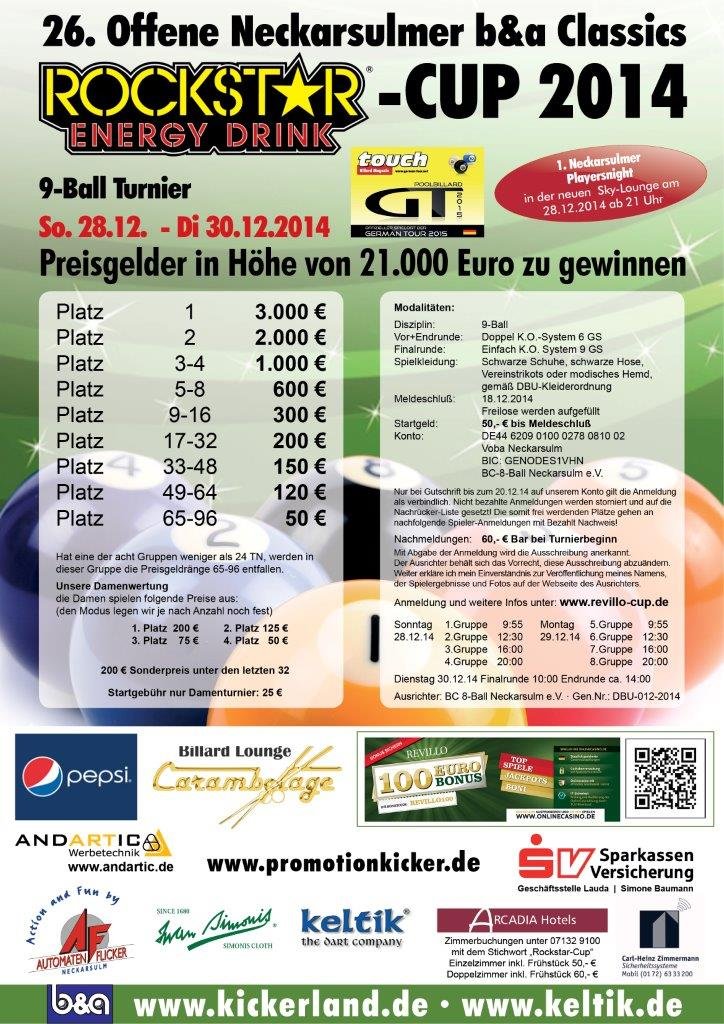 Christian Reimering der Turniergewinner der letzten beiden Jahre hat sich auch dieses Jahr wieder angemeldet und will den Hattrick mit dem 3. Sieg in Folge erziehlen. Sebastian Staab der 2013 zweiter des Turnier wurde, hat sich ebenfalls wieder in Neckarsulm angemeldet. Auch Oliver Ortmann kommt aus Hamburg wieder zum Neckarsulmer Kultturnier. Mit Tony Drago aus Malta hat sich weiter ein Internationaler Top Spieler im Poolbillard sowie im Snooker für das Turnier angemeldet.