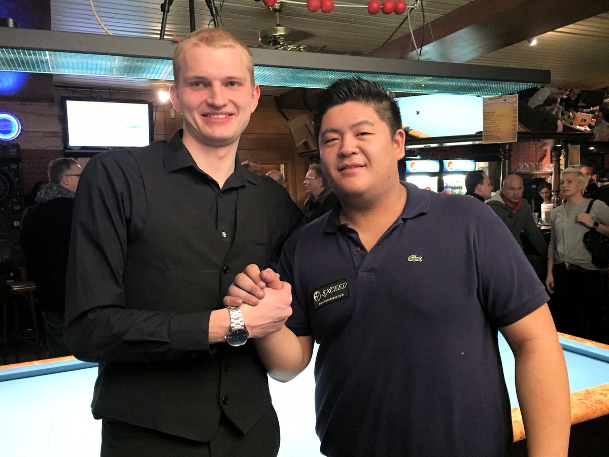 All das interessierte Mario He aber herzlich wenig. Da er zu Beginn des Matches das Ausstoßen gewonnen hatte, war er bei Wechselbreak nun auch bei 8:8 an der Reihe. Wie an der Schnur gezogen gelang das Break, die Eins war blitzsauber spielbar. Ein Raunen ging durch den Saal, denn jeder sah, dass es das gewesen sein müsste. War es auch. Einen kleinen Wackler erlaubte sich He noch, doch die abschließende Neun schenkte ihm sein Widersacher. Sie lag schlicht zu einfach, denn He hatte sein Stellungsspiel zwischenzeitlich zurück erlangt und wieder einmal perfektioniert. Ein großartiges Turnier mit vielen spannenden Matches hatte seinen verdienten Sieger gefunden!